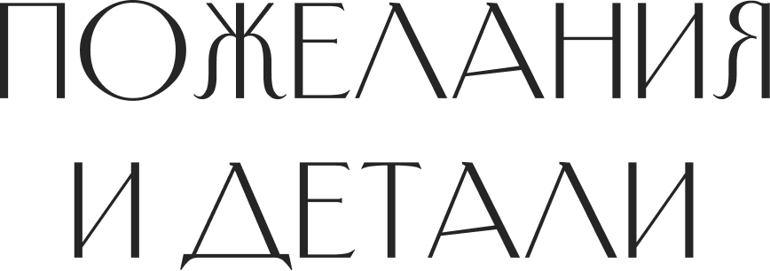 Наша свадьба будет особенной по атмосфере — спокойной, трогательной и немного волшебной. Чтобы сохранить этот настрой, мы с надеждой просим Вас прийти без маленьких помощников. Заранее благодарим за понимание и поддержку!